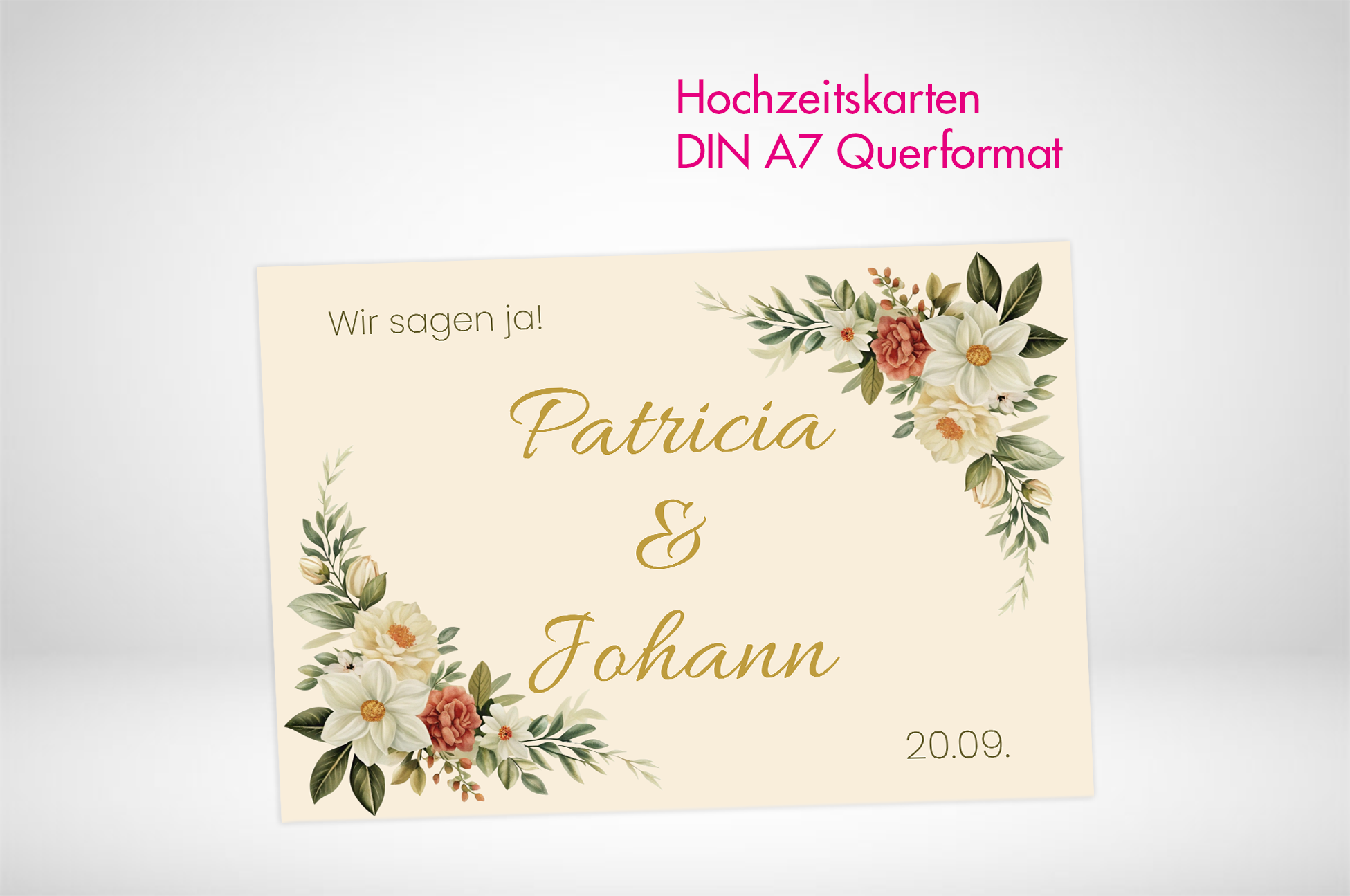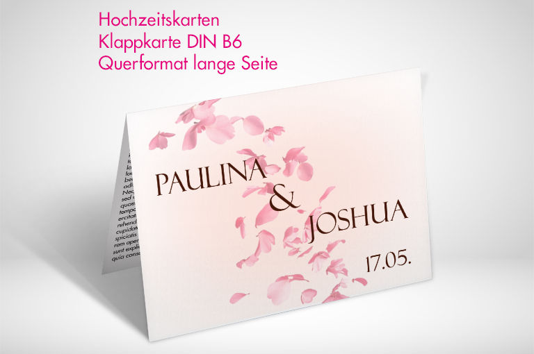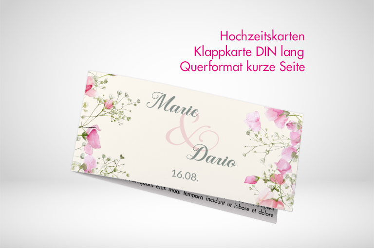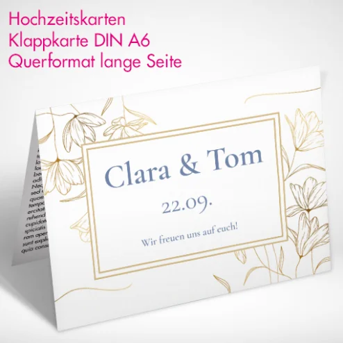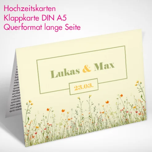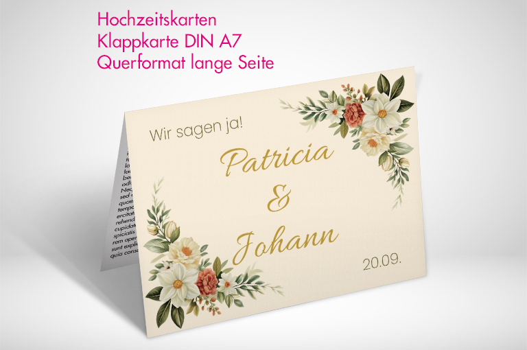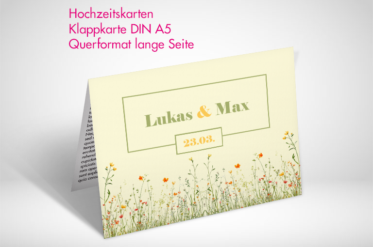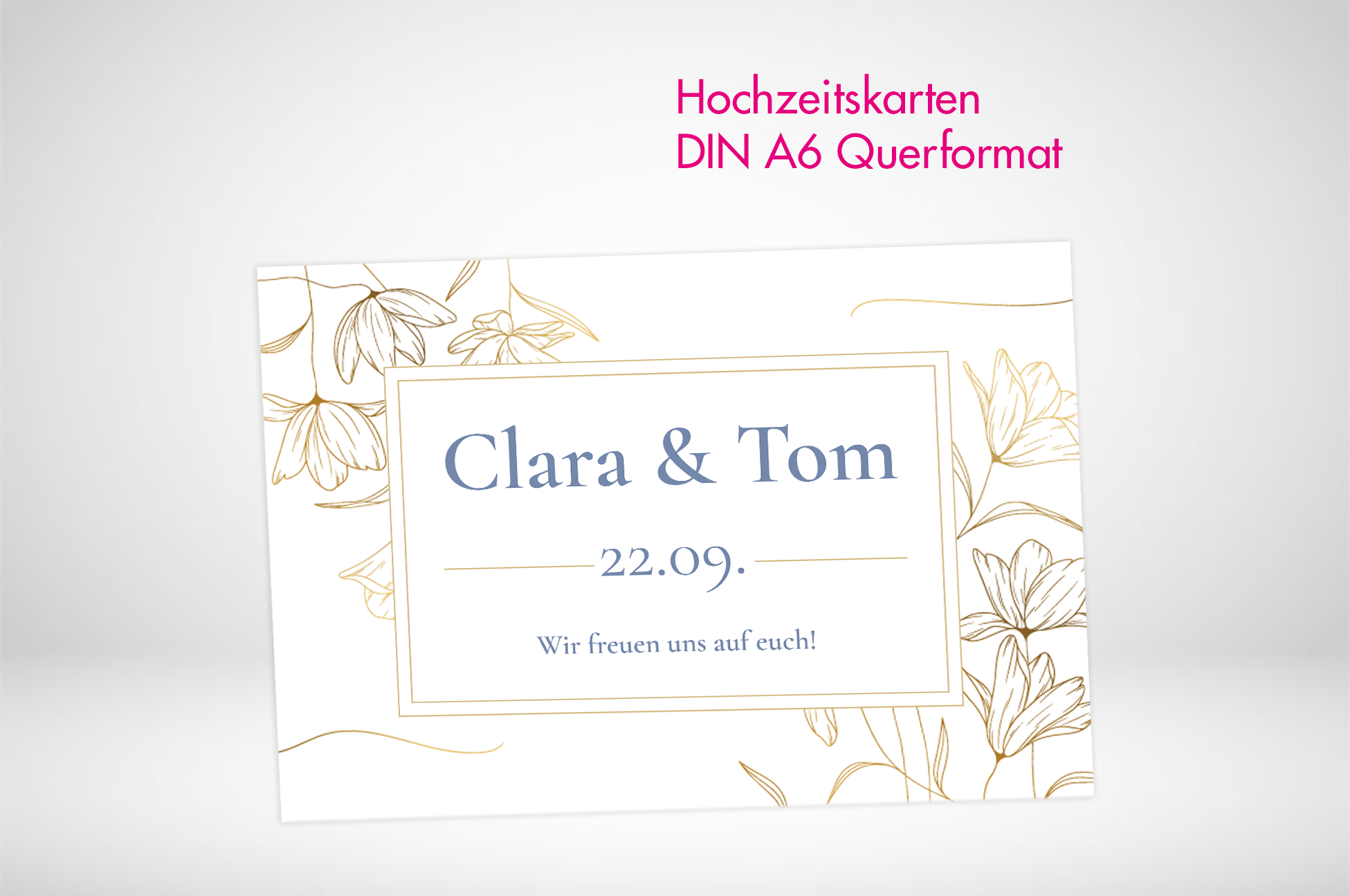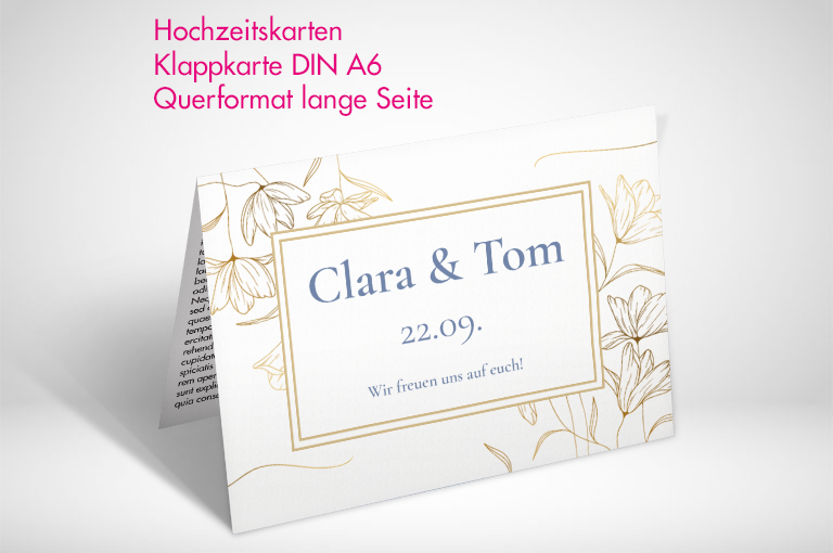 Für viele Paare soll es der schönste Tag ihres Lebens werden. Die eigene Hochzeit! Sobald das Datum feststeht, geht’s los. Um alle Verwandten und Freunde zu informieren druckt man Hochzeitskarten. Diese bieten wir in unserer Online Druckerei in Köln in vielen unterschiedlichen Formaten und Papiersorten an. Neben hochwertigem Leinenkarton finden Sie in der Produktkonfiguration auch zahlreiche weitere Papiere für Ihre Hochzeitskarten. Optional können Sie die passenden Umschläge gleich mitbestellen.