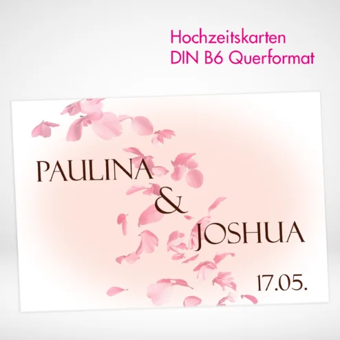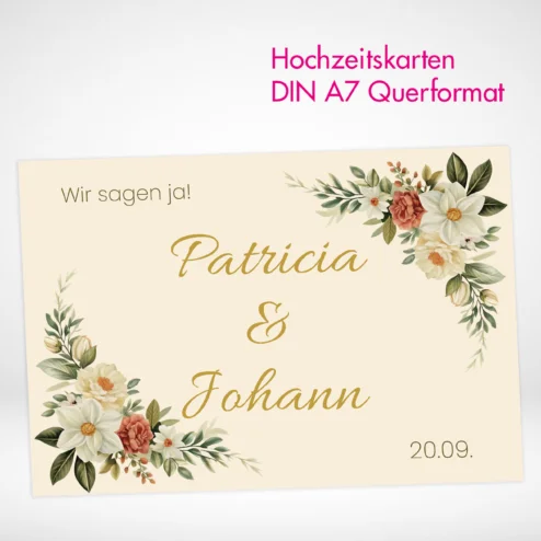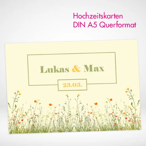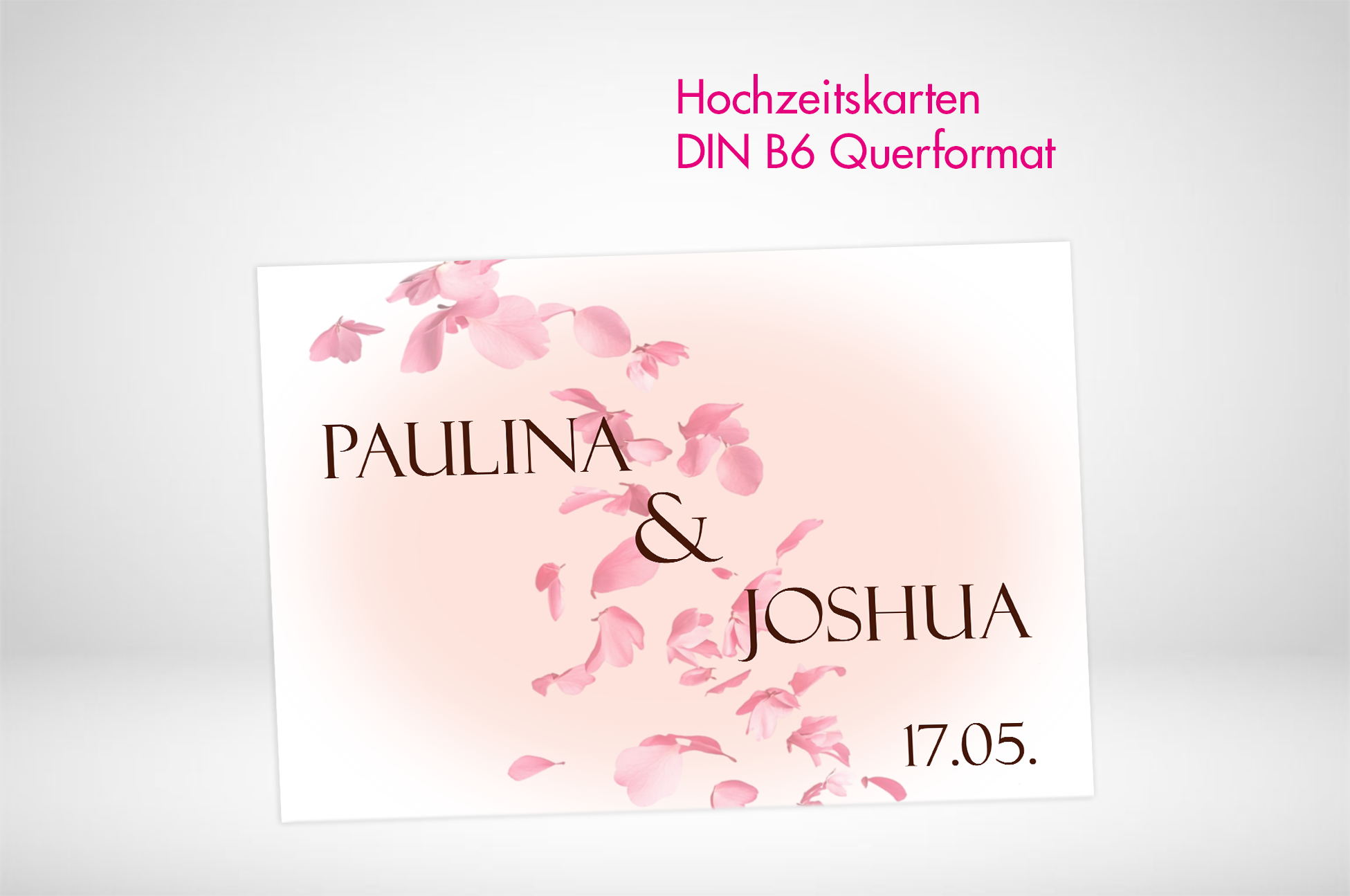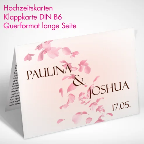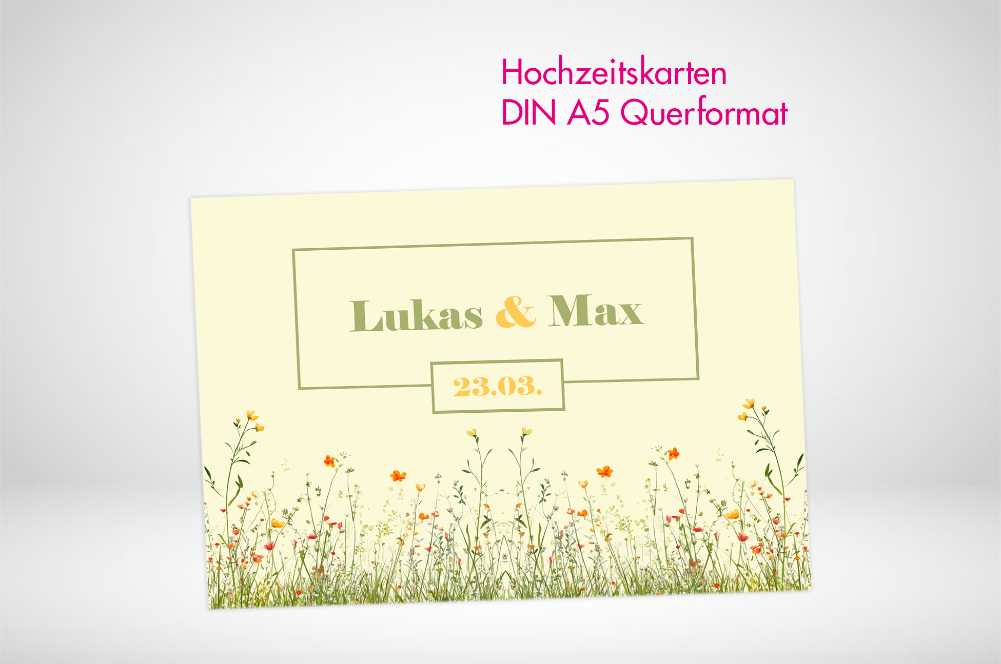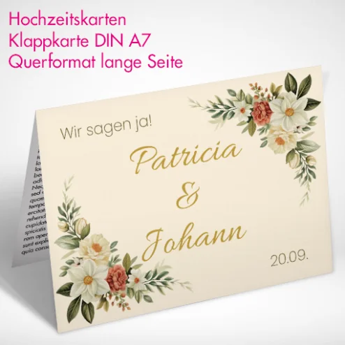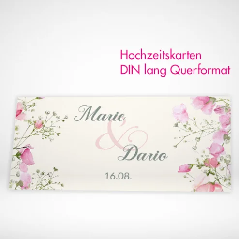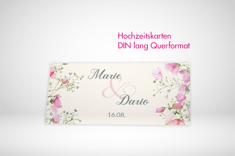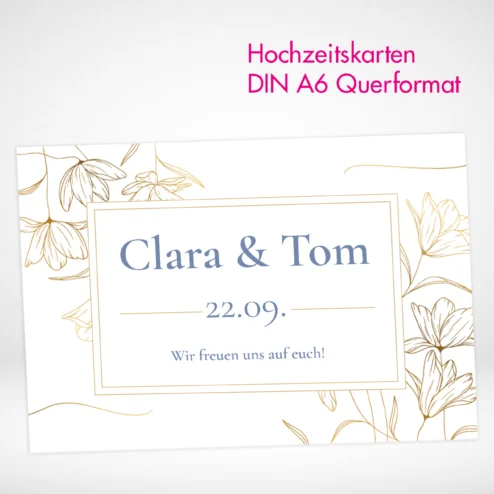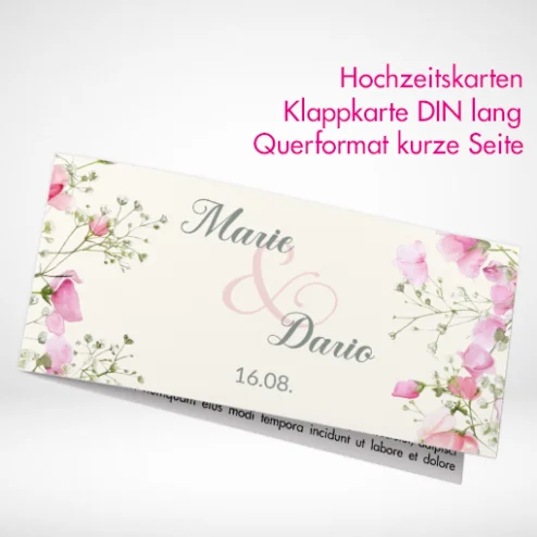 Für viele Paare soll es der schönste Tag ihres Lebens werden. Die eigene Hochzeit! Sobald das Datum feststeht, geht’s los. Um alle Verwandten und Freunde zu informieren druckt man Hochzeitskarten. Diese bieten wir in unserer Online Druckerei in Köln in vielen unterschiedlichen Formaten und Papiersorten an. Neben hochwertigem Leinenkarton finden Sie in der Produktkonfiguration auch zahlreiche weitere Papiere für Ihre Hochzeitskarten. Optional können Sie die passenden Umschläge gleich mitbestellen.