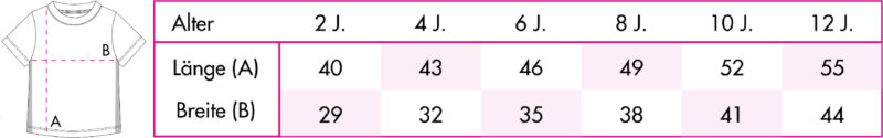 - T-Shirt bedrucken in Größen: 2 Jahre (86/94 cm), 4 Jahre (96/104 cm), 6 Jahre (106/116 cm), 8 Jahre (118/128 cm), 10 Jahre (130/140 cm), 12 Jahre (142/152 cm)